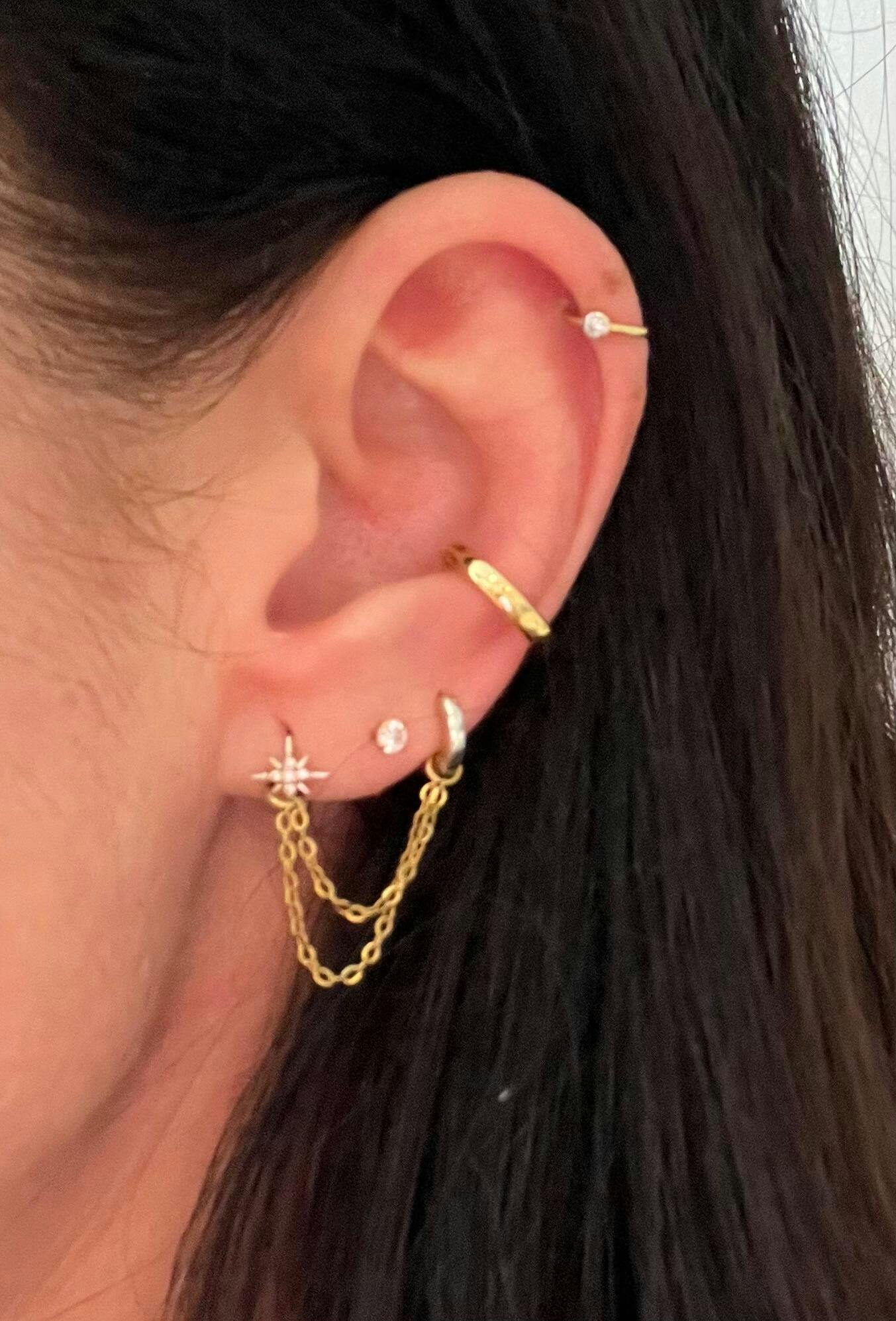 Our stud earrings and hoops are specifically designed for the earlobe and have a 1mm post thickness.
