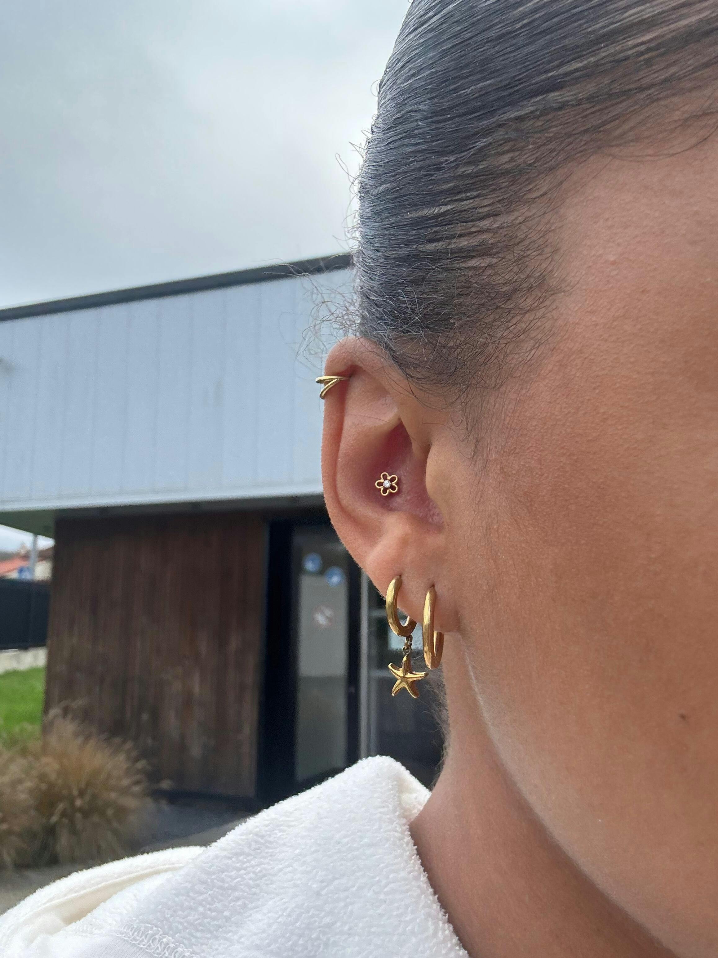 ・ Piercing en forme de fleur dessiné par la créatrice Adélie aux côtés de Maïté notre perceuse professionnelle. 🌸✨