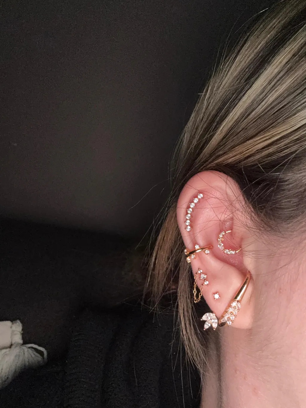 Très beau piercing mais je suis contente qu’il vienne avec une boule ou le petit diams. En effet sur le petit diams un des crochets est un peu décollé ce qui fait que le piercing s’accrochait partout dans mes vêtements. Mais avec la boule aucun soucis et c’est tres Joli.