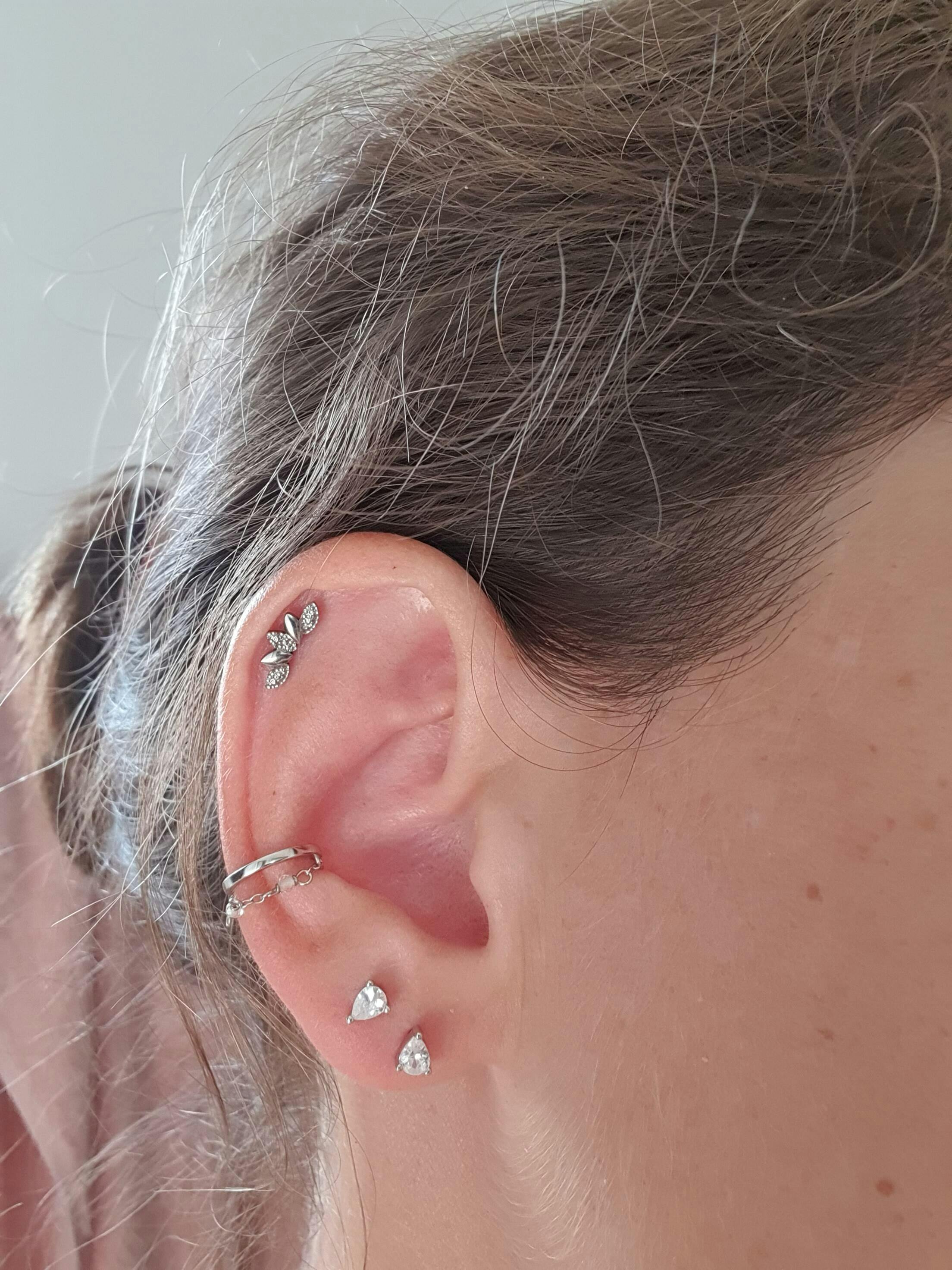 En revanche, nos piercings ont été conçus pour se placer sur le cartilage de votre oreille avec une épaisseur de tige de 1,2mm. Leur tige est donc légèrement plus grande que celle des boucles d'oreilles.