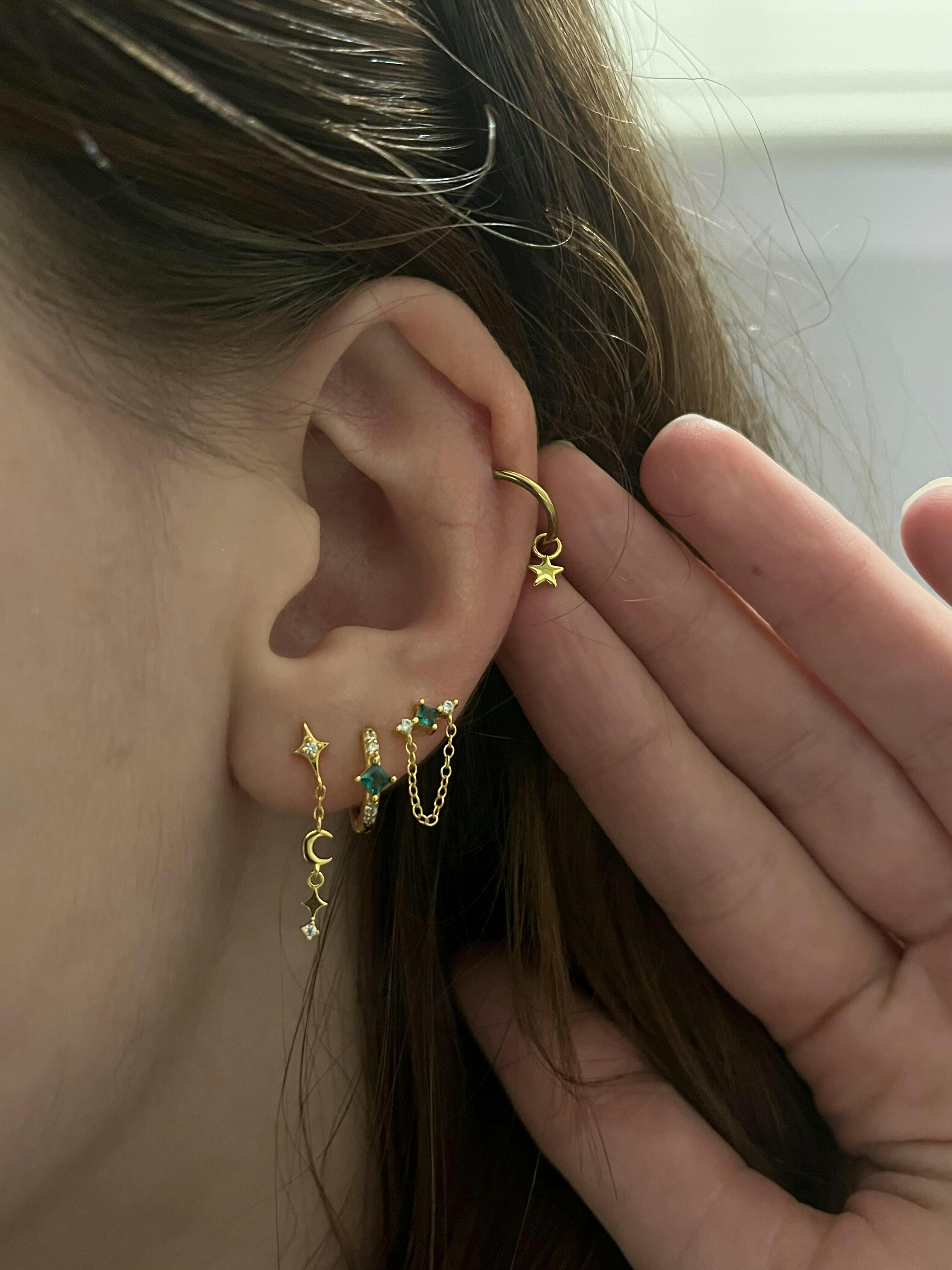 Puce d'oreille pendante accompagnée d'une étoile sertie d'une pierre de zircon blanche et d'une petite Lune. ✨