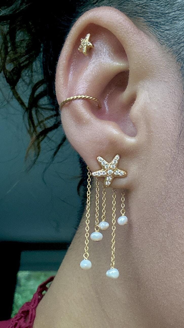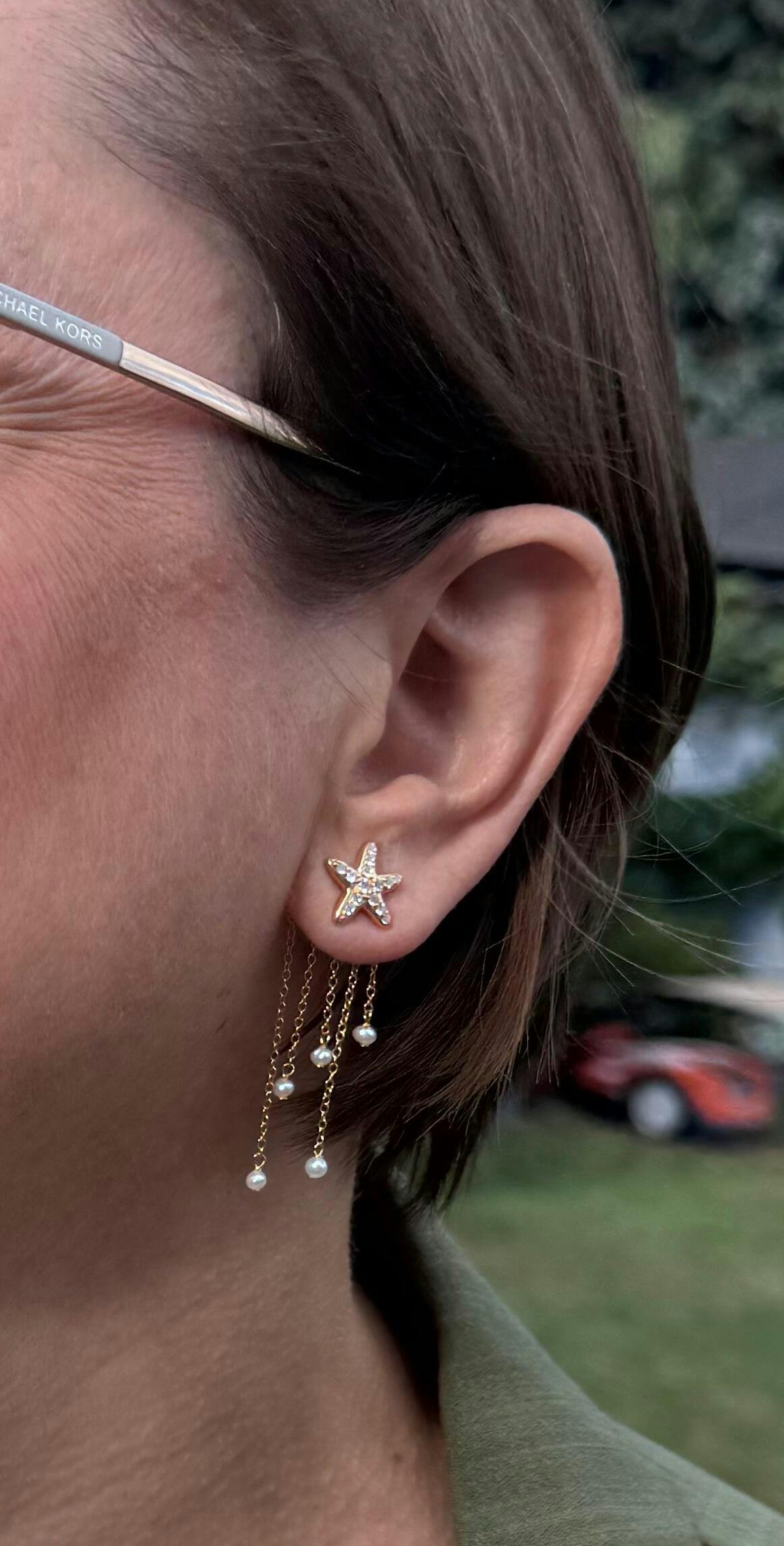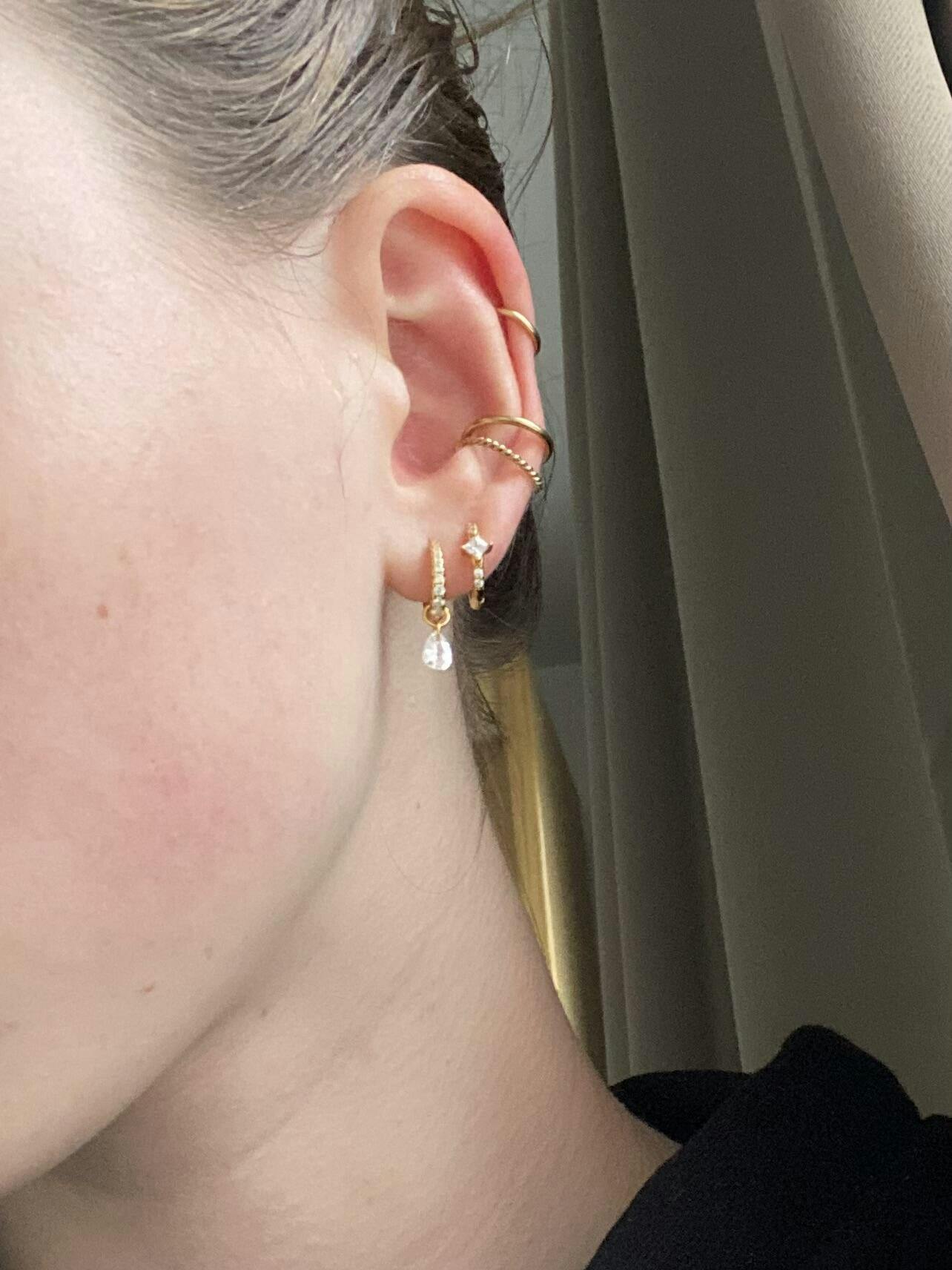 Enfilez la tige de votre puce d'oreille de votre choix dans la petite boucle, placez-le derrière votre oreille. Vous pouvez maintenant admirer une pluie perlée.✨