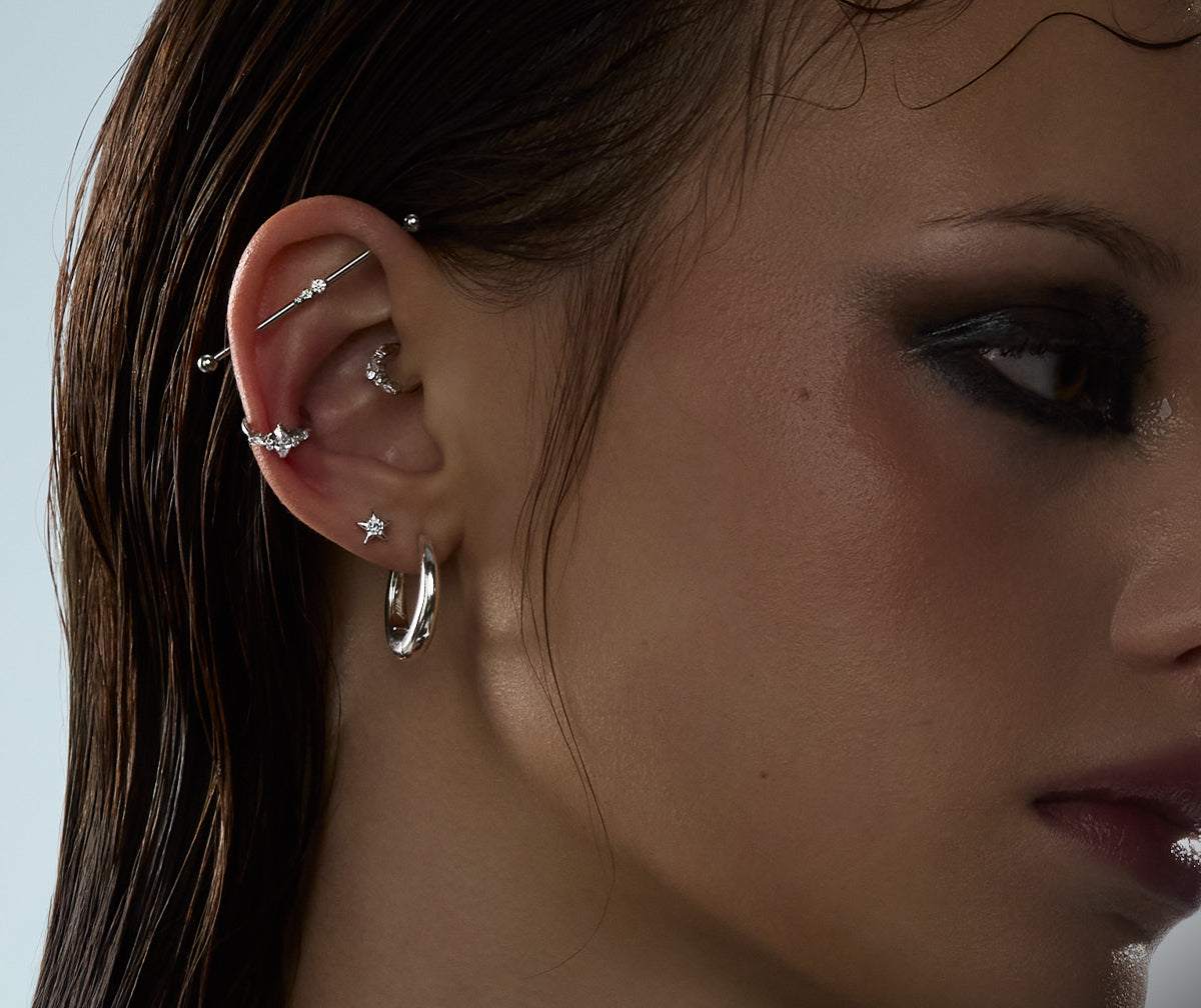 Earfinity© incarne parfaitement le concept novateur derrière nos bijoux en titane Nébuleuse. En un mot, nous avons capturé l'essence d'une gamme sur laquelle nous travaillons depuis plus d'une année : des piercings réversibles, permettant une infinité de compositions. Une innovation dont nous sommes particulièrement fiers !